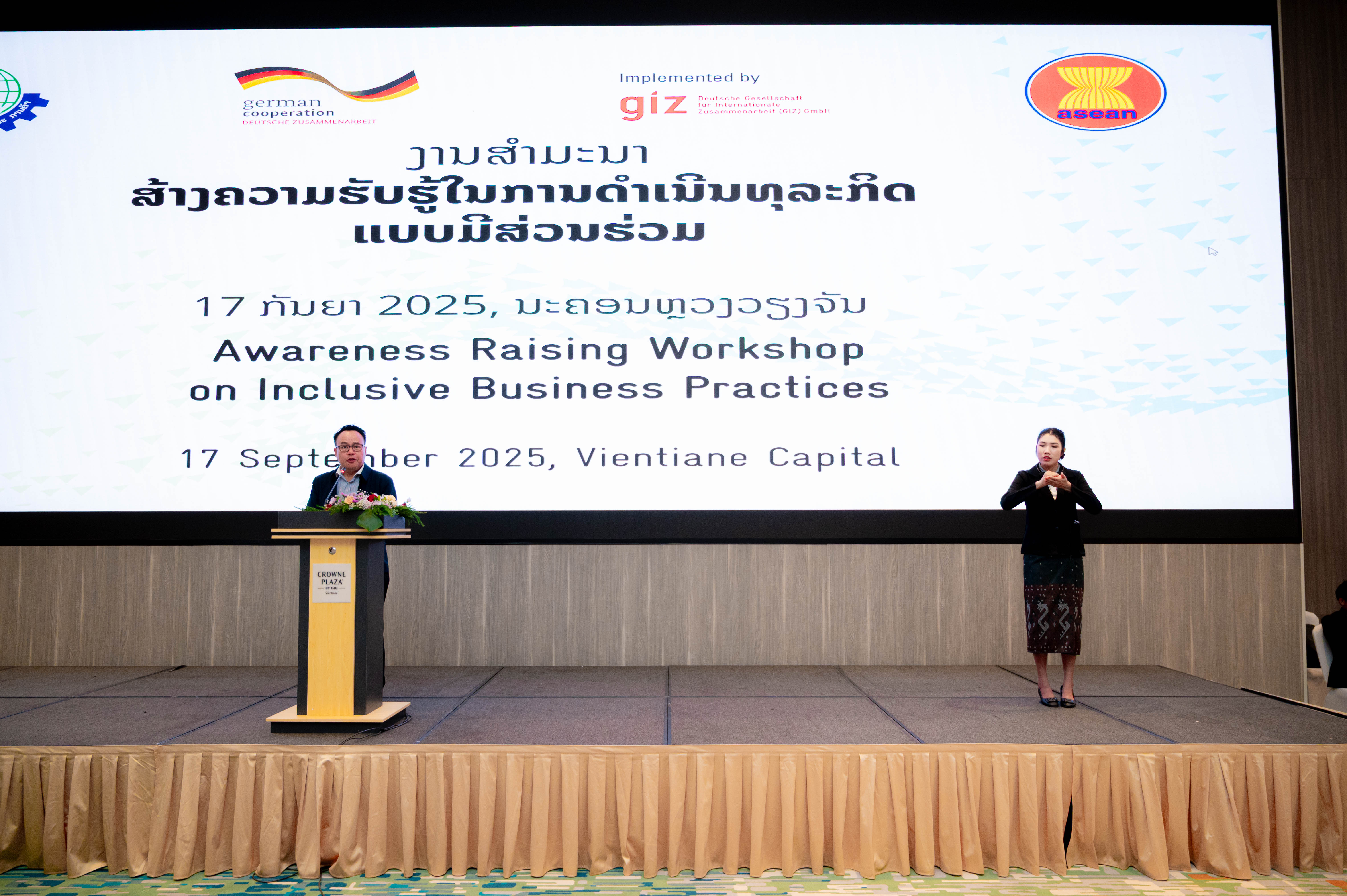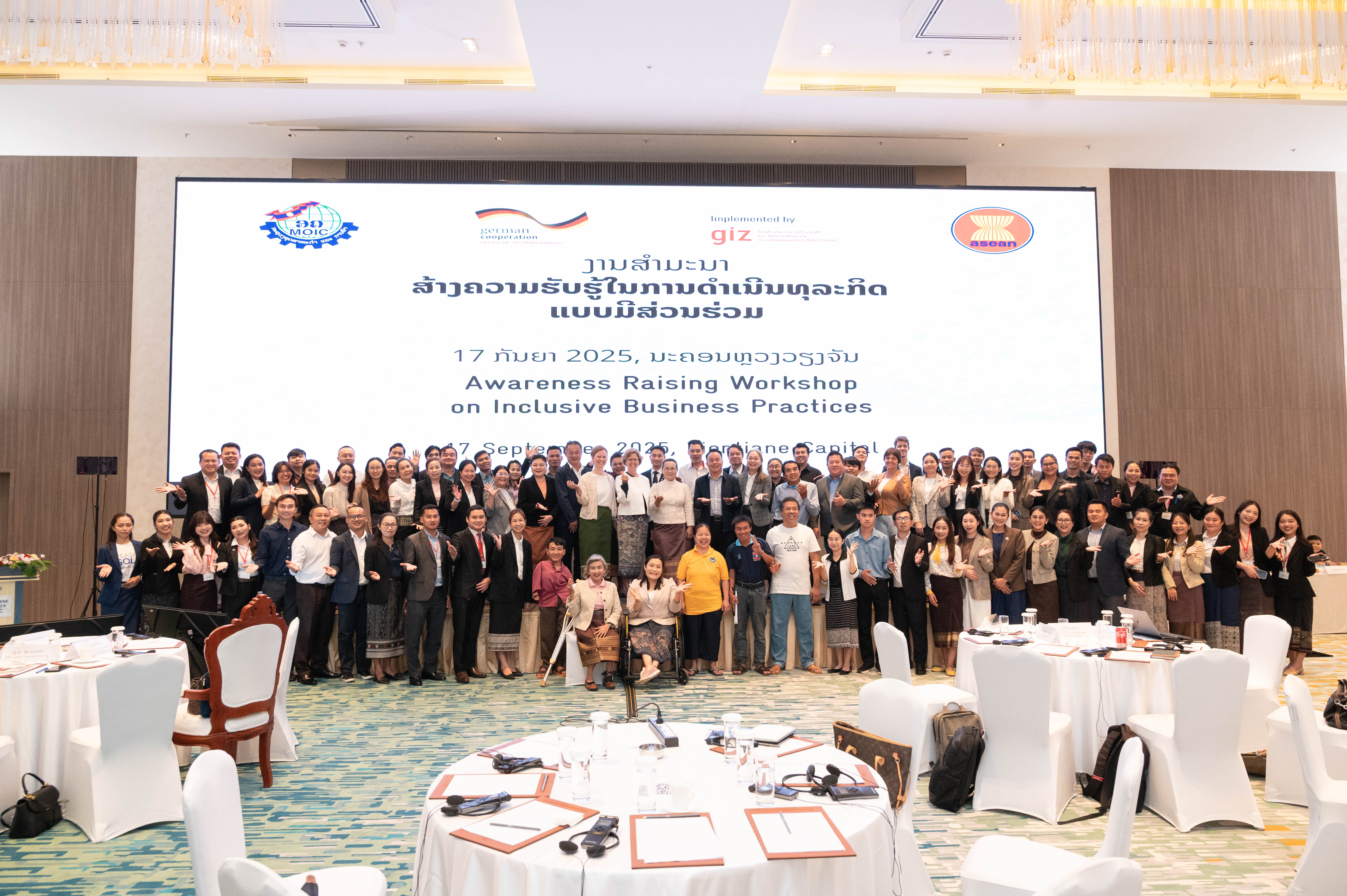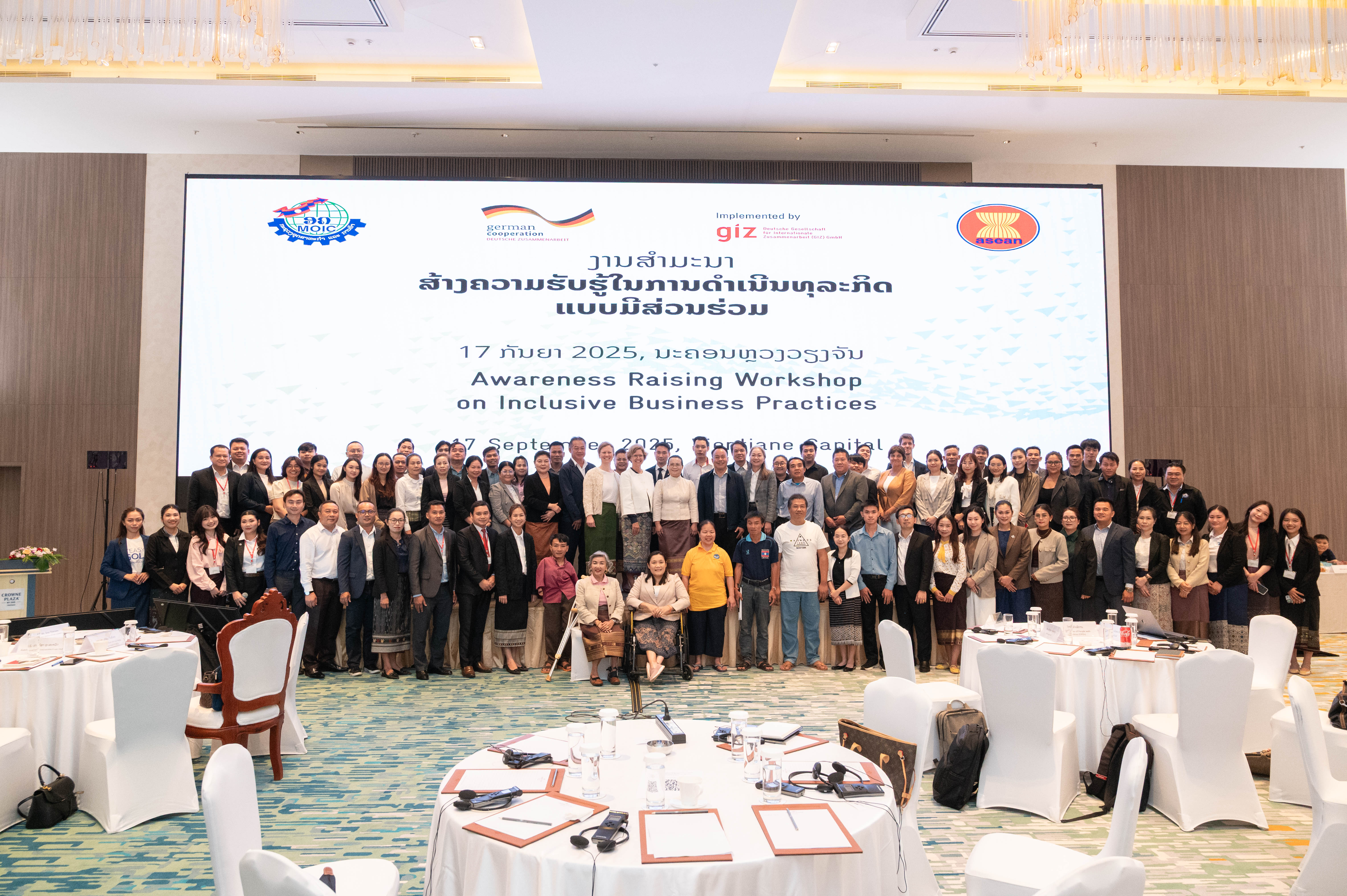 ໃນວັນທີ 17 ກັນຍາ 2025, ກົມການຄ້າພາຍໃນ, ກະຊວງອຸດສາຫະກຳ ແລະ ການຄ້າ (ອຄ) ຮ່ວມກັບ ກົມນະໂຍບາຍຕໍ່ຜູ້ມີຜົນງານ, ຄົນພິການ ແລະ ຜູ້ສູງອາຍຸ, ກະຊວງ ແຮງງານ ແລະ ສະຫວັດດີການສັງຄົມ ໄດ້ຈັດງານສໍາມະນາຄັ້ງທຳອິດຂອງ ສປປ ລາວ ພາຍໃຕ້ຫົວຂໍ້: “ການຍົກລະດັບຄວາມຮັບຮູ້ແນວທາງໃນການດໍາເນີນທຸລະກິດແບບມີສ່ວນຮ່ວມ ໃນ ສປປ ລາວ (Awareness Raising on Inclusive Business Practice in Laos)”ທີ່ ໂຮງແຮມ ຄລາວ ພລາຊາ, ນະຄອນຫຼວງວຽງຈັນ, ໂດຍການເປັນປະທານຮ່ວມຂອງ ທ່ານ ສັນຕິສຸກ ພູນສະຫວັດ, ຫົວໜ້າກົມການຄ້າພາຍໃນແລະ ທ່ານ ນາງ ມະນີວັນ ກິດຕິລາດ, ຮອງຫົວໜ້າກົມນະໂຍບາຍຕໍ່ຜູ້ມີຜົນງານ, ຄົນພິການ ແລະ ຜູ້ສູງອາຍຸ, ຊຶ່ງມີຜູ້ເຂົ້າຮ່ວມທັງໝົດຈາກພາກລັດ ແລະ ທຸລະກິດ ຫຼາຍກວ່າ 100 ຄົນ ພາຍໃຕ້ການສະໜັບສະໜູນຂອງໂຄງການ GIZ-PROTECT II ຂອງລັດຖະບານເຢຍລະມັນ. ຈຸດປະສົງຕົ້ນຕໍຂອງງານສໍາມະນາໃນຄັ້ງນີ້ ແມ່ນ ເພື່ອຊຸກຍູ້ສົ່ງເສີມໃຫ້ມີການດຳເນີນທຸລະກິດແບບມີສ່ວນຮ່ວມ ໂດຍໃຫ້ຄວາມສຳຄັນກັບ ກຸ່ມຜູ້ຊົມໃຊ້ທີ່ມີຄວາມບອບບາງ ເຊັ່ນ ຄົນພິການ, ຜູ້ສູງອາຍຸ, ແມ່ຍິງ, ເດັກນ້ອຍ ແລະ ຊົນເຜົ່າ ຊຶ່ງໄດ້ຮັບສິດອັນຊອບທຳ ພາຍໃຕ້ກົດໝາຍວ່າດ້ວຍການປົກປ້ອງຜູ້ຊົມໃຊ້ ເພື່ອໃຫ້ພວກເຂົາ ໄດ້ສາມາດເຂົ້າເຖິງສິນຄ້າ ແລະການບໍລິການຕ່າງໆເຊັ່ນດຽວກັບຄົນທົ່ວໄປ; ພ້ອມນັ້ນ, ກໍເປັນການສ້າງຕາໜ່າງການເຮັດວຽກຮ່ວມກັນ ລະຫວ່າງ ພາກລັດ, ພາກທຸລະກິດ ແລະ ກຸ່ມຄົນທີ່ບອບບາງ ເພື່ອໃຫ້ສາມາດເຂົ້າໃຈກ່ຽວກັບແນວທາງໃນການດຳເນີນທຸລະກິດແບບມີສ່ວນຮ່ວມ, ແລກປ່ຽນຄວາມຮູ້ ແລະ ປະສົບການຕົວຈິງໃນການດຳເນີນທຸລະກິດແບບມີສ່ວນຮ່ວມຈາກທຸລະກິດຕົວແບບພາຍໃນ ສປປ ລາວ.